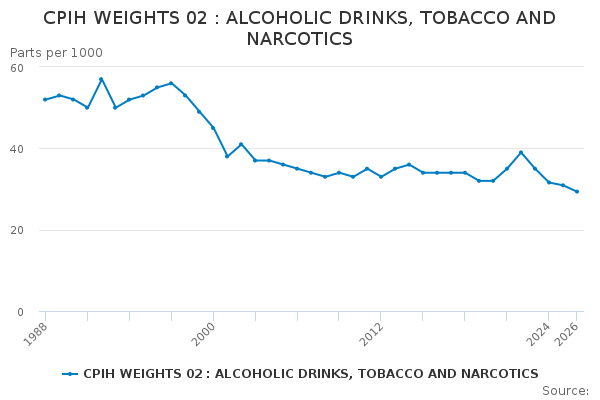 Download this time seriesCPIH WEIGHTS 02 : ALCOHOLIC DRINKS, TOBACCO AND NARCOTICS