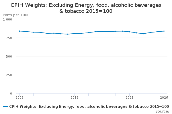 Download this time seriesCPIH Weights: Excluding Energy, food, alcoholic beverages & tobacco 2015=100