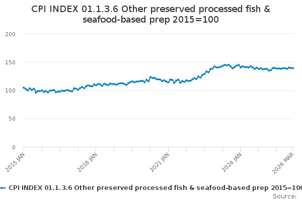 Download this time seriesCPI INDEX 01.1.3.6 Other preserved processed fish & seafood-based prep 2015=100