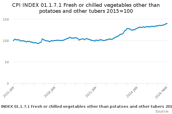 Download this time seriesCPI INDEX 01.1.7.1 Fresh or chilled vegetables other than potatoes and other tubers 2015=100