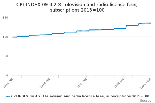 Download this time seriesCPI INDEX 09.4.2.3 Television and radio licence fees, subscriptions 2015=100