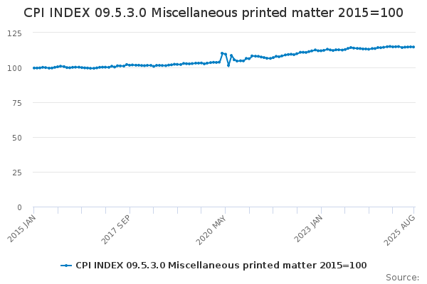 Download this time seriesCPI INDEX 09.5.3.0 Miscellaneous printed matter 2015=100