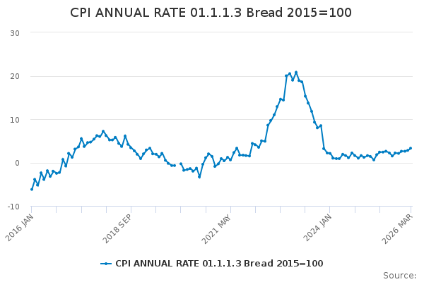 Download this time seriesCPI ANNUAL RATE 01.1.1.3 Bread 2015=100