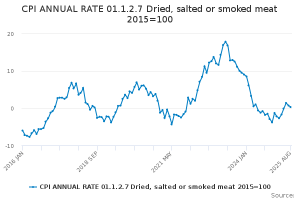 Download this time seriesCPI ANNUAL RATE 01.1.2.7 Dried, salted or smoked meat 2015=100