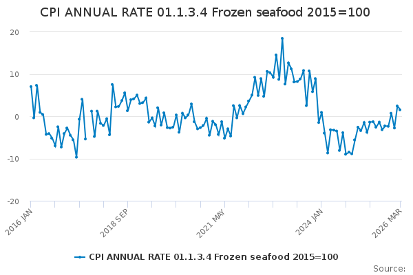 Download this time seriesCPI ANNUAL RATE 01.1.3.4 Frozen seafood 2015=100