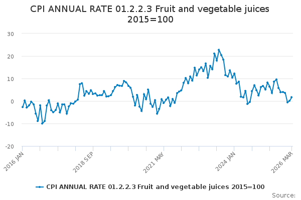 Download this time seriesCPI ANNUAL RATE 01.2.2.3 Fruit and vegetable juices 2015=100