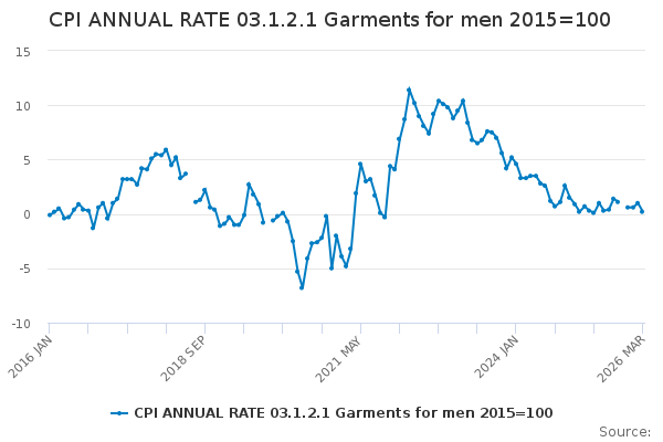 Download this time seriesCPI ANNUAL RATE 03.1.2.1 Garments for men 2015=100