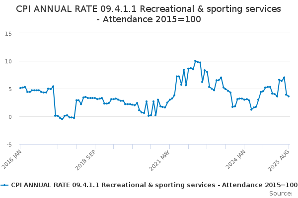 Download this time seriesCPI ANNUAL RATE 09.4.1.1 Recreational & sporting services - Attendance 2015=100