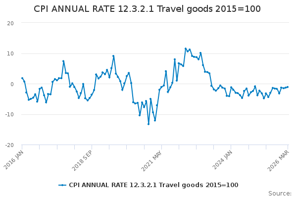Download this time seriesCPI ANNUAL RATE 12.3.2.1 Travel goods 2015=100