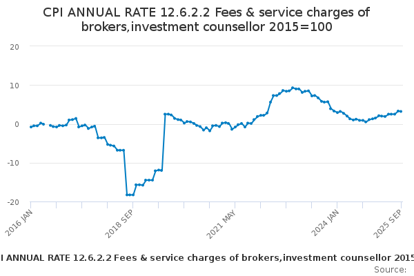 Download this time seriesCPI ANNUAL RATE 12.6.2.2 Fees & service charges of brokers,investment counsellor 2015=100