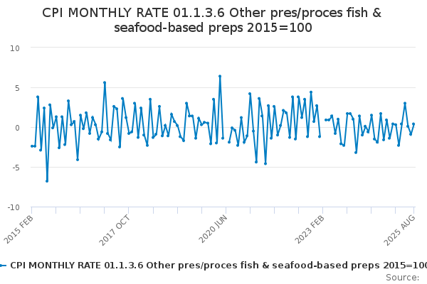 Download this time seriesCPI MONTHLY RATE 01.1.3.6 Other pres/proces fish & seafood-based preps 2015=100