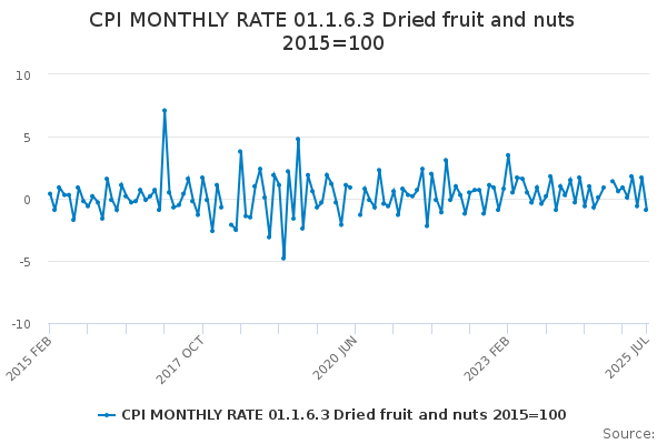 Download this time seriesCPI MONTHLY RATE 01.1.6.3 Dried fruit and nuts 2015=100