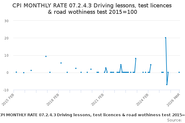 Download this time seriesCPI MONTHLY RATE 07.2.4.3 Driving lessons, test licences & road wothiness test 2015=100