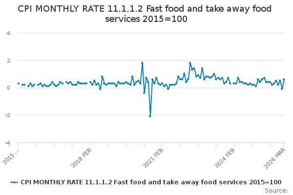Download this time seriesCPI MONTHLY RATE 11.1.1.2 Fast food and take away food services 2015=100