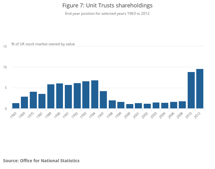 - Unit trusts: Comprises authorised unit trusts, including PEP/ISAs run by unit trusts. Open-ended investment companies (OEICs) are now included in this category, rather than investment trusts as both unit trust and OEICs are open ended funds