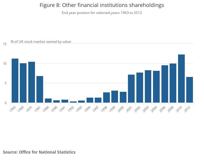 Other outputs can sometimes be measuring something different eg economic exposure or interest. The ONS statistical bulletin MQ5: Investment by Insurance Companies, Pension Funds and Trusts also reports investment in UK quoted shares by insurance companies. The numbers can sometimes differ significantly from the figures reported here. The difference could in part be attributed to funds and other investment instruments run by insurance companies, which the 2012 share ownership categorises as other financial institutions. In addition, the analysis of share registers to identify the true ownership of pooled nominee accounts classifies pension funds run by insurance companies as pension funds.