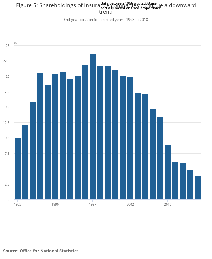 Image .csv .xlsInsurance companies’ proportions have fallen since 1997 from a high of 23.6%. In recent years this has seen five consecutive record lows set, with 2018 standing at 3.9%.