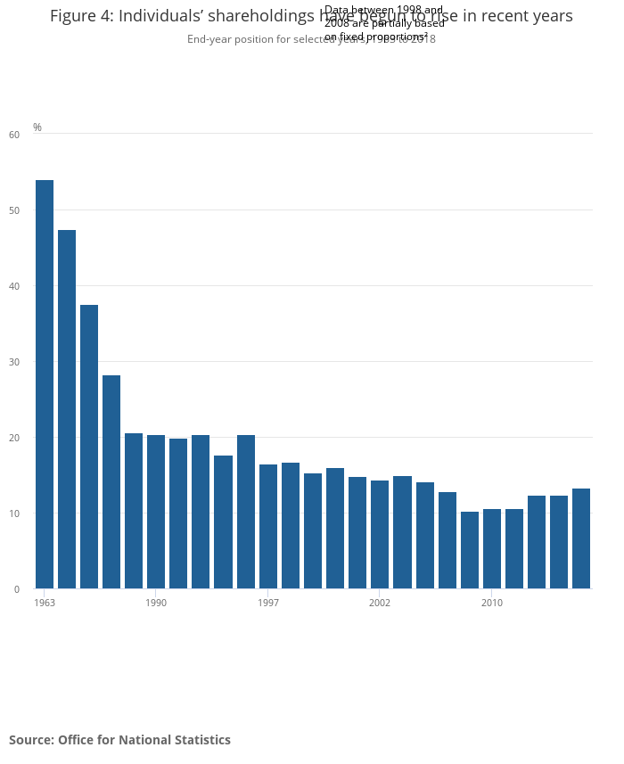Image .csv .xlsThe proportion of shares held by individuals has declined since 1963, when individuals owned approximately 54% of UK quoted shares in terms of total value. However, this trend has changed since the record low in 2008 (10.2%), indicating a change in investment strategy by individuals, and at the end of 2018 stood at 13.3% of all UK quoted shares.