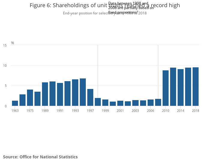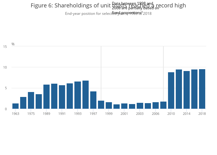 Image .csv .xlsThe 2010 estimate of 8.8% was a substantial increase from the level in earlier years, and the 2018 estimate surpasses this at a high of 9.6%. Note that between 1998 and 2008, it was assumed that 3% of the value of shares held by multiple-ownership pooled nominee accounts would have underlying ownership by unit trusts.