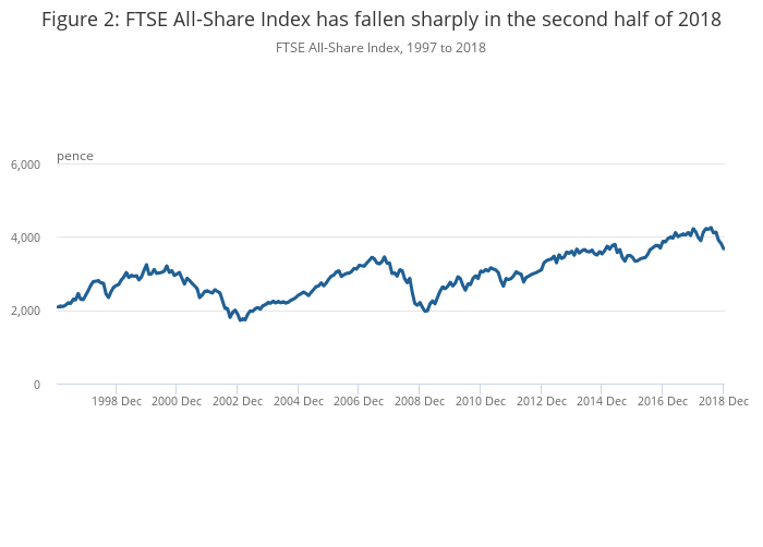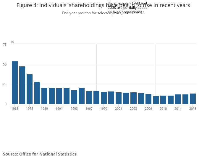 Image .csv .xlsThe proportion of shares held by individuals has declined since 1963, when individuals owned approximately 54% of UK quoted shares in terms of total value. However, this trend has changed since the record low in 2008 (10.2%), indicating a change in investment strategy by individuals, and at the end of 2018 stood at 13.5% of all UK quoted shares.