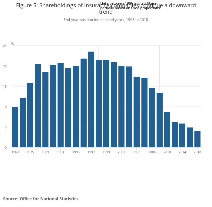 In recent years, insurance companies have been moving away from UK shares and investing more in overseas securities and mutual funds. Evidence of this is observed in the MQ5: Investment by insurance companies, pension funds and trusts publication dataset. This investment in mutual funds may indicate that these businesses adopted a strategy of passive investment during this period.