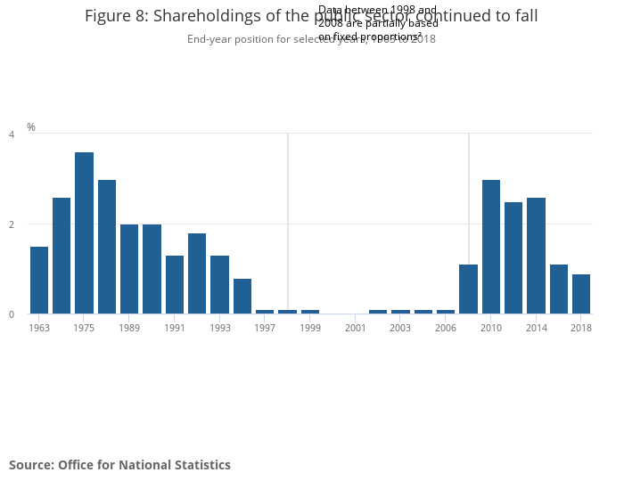 Image .csv .xlsThe UK government participated in the recapitalisation of several banks following the 2008 economic downturn. Since 2016, the remaining shares owned by the UK government in Lloyds TSB Group have been sold, reducing the proportion of public sector owned UK quoted shares. However, the government still owns a majority stake in the Royal Bank of Scotland.