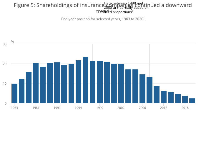 Image .csv .xlsInsurance companies’ proportions in UK quoted shares have fallen since 1997, from a high of 23.6% to the 2020 level of 2.5%, the lowest on record.