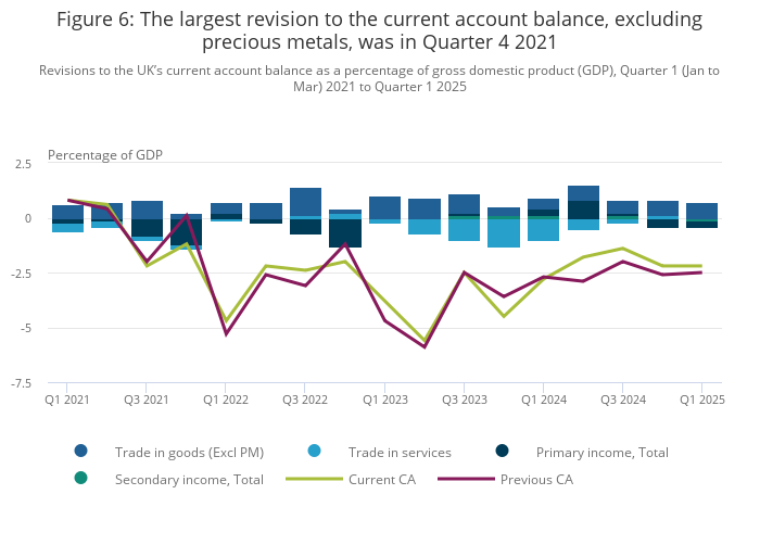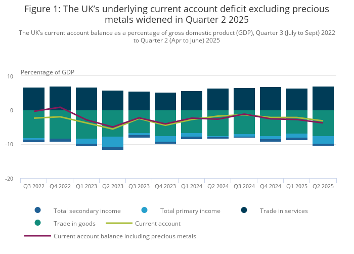 The underlying UK current account deficit excluding precious metals widened to £23.8 billion, or 3.2% of gross domestic product (GDP), in Quarter 2 (Apr to June) 2025. This is a change of £7.3 billion from the deficit of £16.5 billion (2.2% of GDP) in the previous quarter, revised from £18.6 billion.