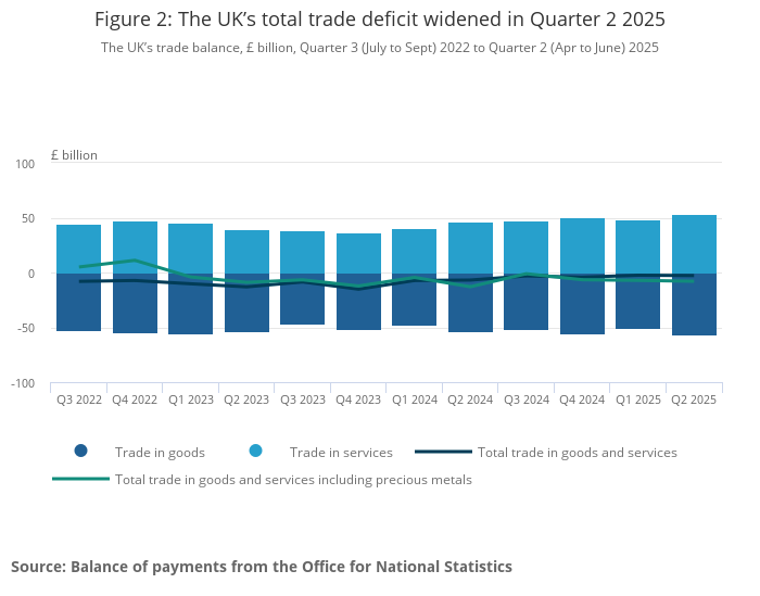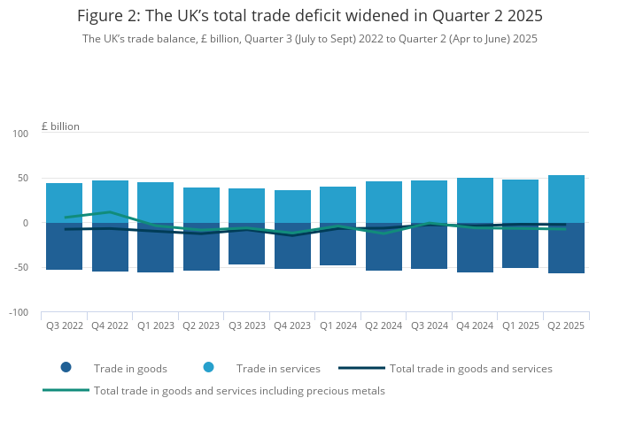 The total trade deficit, excluding precious metals, widened to £2.8 billion (0.4% of GDP) in Quarter 2 2025, compared with £2.5 billion (revised from £7.5 billion) in the previous quarter; the goods deficit widened to £56.6 billion, and the services surplus increased to £53.8 billion.