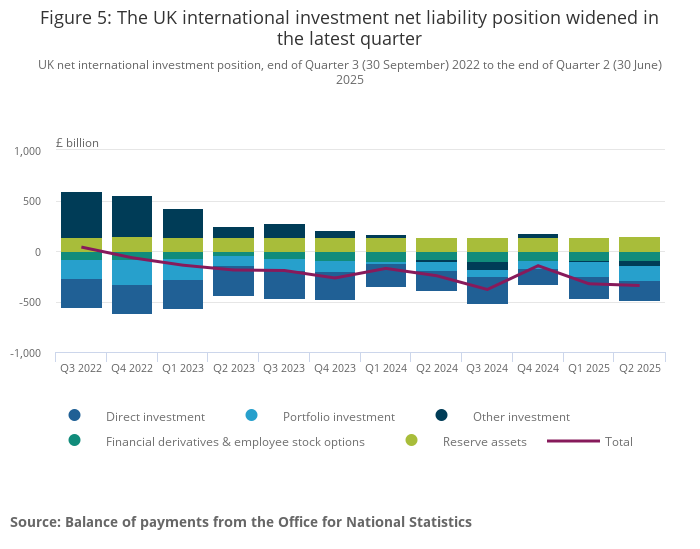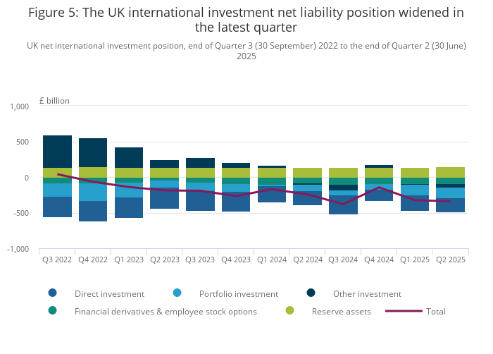 The preliminary estimate of the IIP net liability position was £341.8 billion at the end of Quarter 2 (30 June) 2025, compared with £324.4 billion at the end of Quarter 1 (31 March) 2025 (revised from £371.5 billion). This was because the value of UK liabilities increased by more than UK assets.