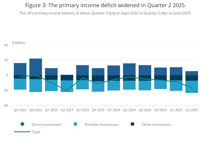 The primary income account deficit widened from £9.1 billion in Quarter 1 2025 (revised from £6.4 billion) to £16.8 billion (or 2.2% of GDP) in Quarter 2 2025, as credits decreased and debits increased.
