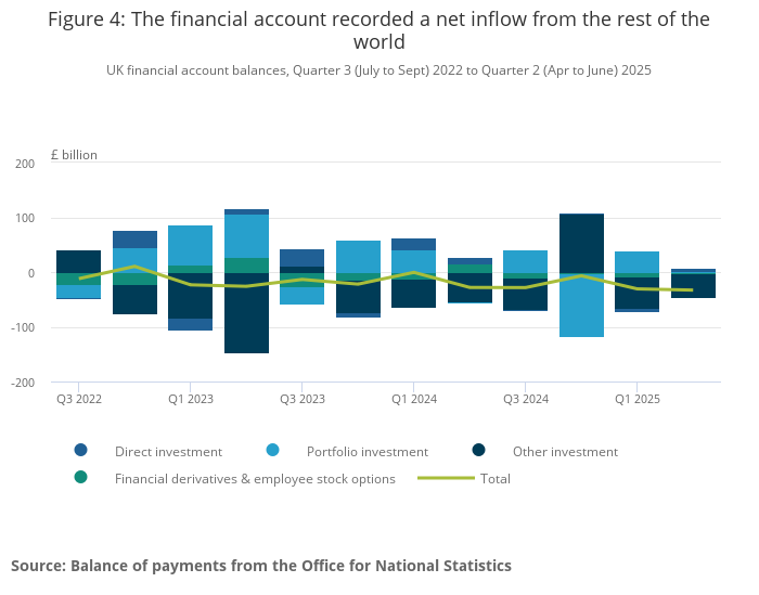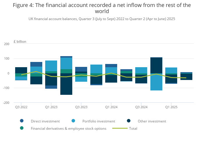 The financial account recorded a net inflow of £33.0 billion in Quarter 2 (Apr to June) 2025 after recording a net inflow of £30.8 billion in Quarter 1 (Jan to Mar) 2025.
