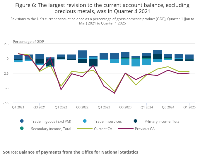 In line with our National Accounts Revisions Policy, the data accompanying this release are open to revision. Revisions to the current account balance in recent years are because of incorporating methods improvements and updated Trade, and Foreign direct investment survey data. The largest revisions were in Quarter 4 (Oct to Dec) 2021, when the current account balance was revised by 1.3% of gross domestic product (GDP). Further details of the impact of methods improvements to Trade statistics for the years 1997 to 2023, are available in our Blue Book and Pink Book 2025: UK trade impact estimates article. This article explains that the largest impact on trade statistics is from improvements in the way we measure global production arrangements (globalisation), which have resulted in higher estimates of goods exports.