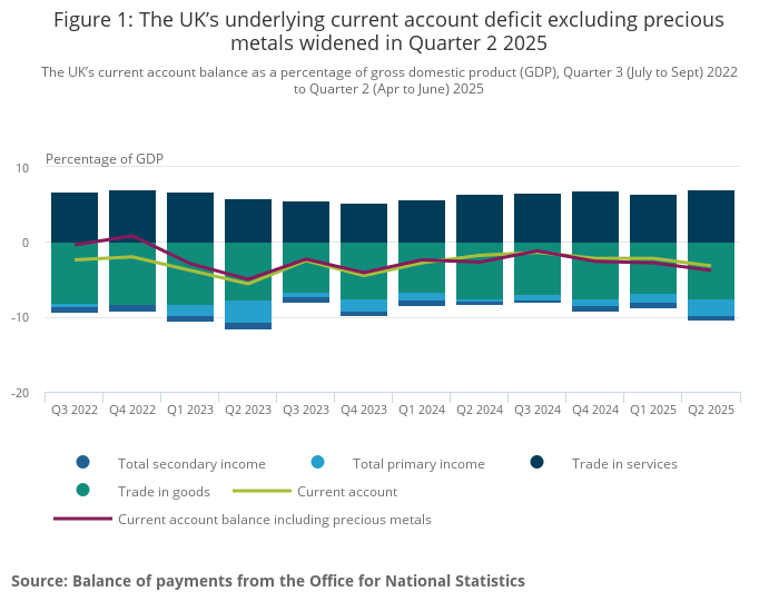 Figure 1: The UK’s underlying current account deficit excluding precious metals widened in Quarter 2 2025