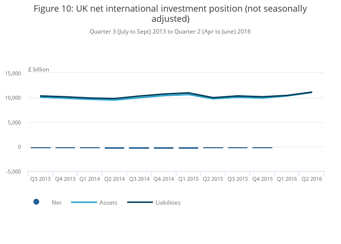 The international investment position showed net external liabilities (that is, liabilities exceed assets) of £57.0 billion at the end of Quarter 2 2016, compared with net external liabilities of £97.4 billion at the end of Quarter 1 2016.