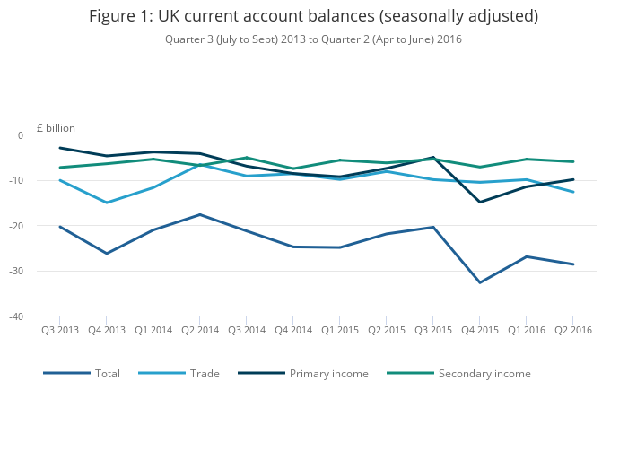 The UK’s current account deficit was £28.7 billion in Quarter 2 (April to June) 2016, up from a revised deficit of £27.0 billion in Quarter 1 (January to March) 2016. The deficit in Quarter 2 2016 equated to 5.9% of gross domestic product (GDP) at current market prices, up from 5.7% in Quarter 1 2016.