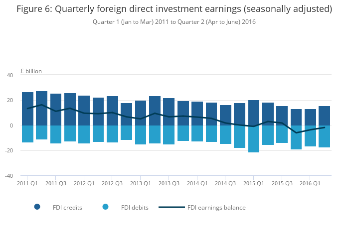 Foreign direct investment (FDI) net earnings have followed a broadly downward trend from 2011, falling from an average surplus of £13.4 billion per quarter in 2011 to a record deficit of £6.2 billion in Quarter 4 2015. This was driven by consistent falls in credits, whilst debits increased slightly over the same period. The deficit in net FDI earnings narrowed in the first 2 quarters of 2016, reaching a deficit of £2.0 billion in Quarter 2 2016.
