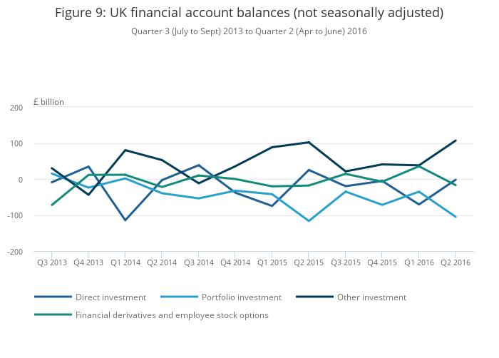 The total financial account showed a net inflow (that is, more money flowing into the UK) of £14.5 billion in Quarter 2 2016, compared with a net inflow of £30.5 billion in Quarter 1 2016.