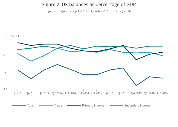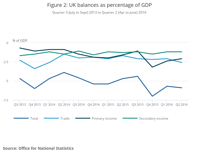 The primary income deficit narrowed from £11.5 billion in Quarter 1 2016, to £10.0 billion in Quarter 2 2016.