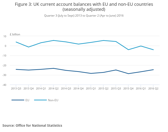 The current account deficit with non-EU countries widened from £0.2 billion in Quarter 1 2016 to £4.1 billion in Quarter 2 2016. This was mainly due to the total trade surplus narrowing from £7.5 billion in Quarter 1 2016 to £3.7 billion in Quarter 2 2016. Additionally, the deficit on secondary income widened from £2.9 billion in Quarter 1 2016 to £3.5 billion in Quarter 2 2016. Partially offsetting these was a narrowing in the deficit on primary income from £4.8 billion in Quarter 1 2016 to £4.3 billion in Quarter 2 2016.