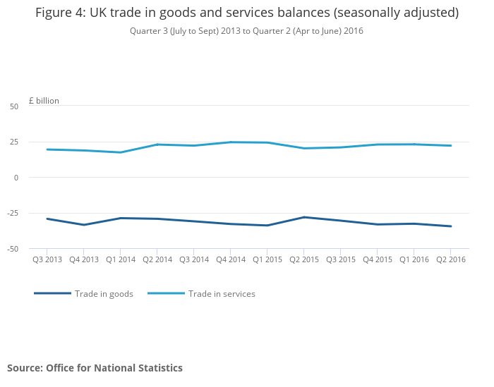 The total trade deficit widened to £12.7 billion in Quarter 2 2016, from £10.0 billion in Quarter 1 2016. This was due to the trade in goods deficit widening by £1.8 billion and a £0.9 billion narrowing in the trade in services surplus.