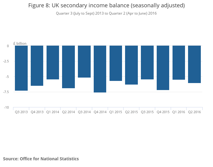 The deficit on secondary income widened from £5.5 billion in Quarter 1 2016 to £6.0 billion in Quarter 2 2016. This was due to payments increasing while receipts remained virtually unchanged.