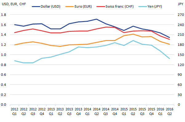 .png (19.6 kB) .xls (20.5 kB)Figure 11 presents sterling exchange rates against the currencies of major trading partner countries at the close of markets at each quarter end. The chart shows that sterling has been depreciating against most currencies since Quarter 2 2015. From Quarter 4 2015, sterling weakened markedly and continued to weaken following the European Union referendum held in the latter part of Quarter 2 2016. This weakening has in part contributed to the decrease in the UK’s net liability position.