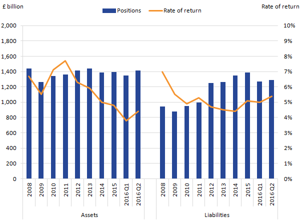 The FDI net earnings deficit continued to narrow in Quarter 2 2016. In contrast to the first quarter, this was driven by an increase in FDI credits, as opposed to a decrease in debits. FDI credits increased from £13.0 billion to £15.3 billion between Quarter 1 2016 and Quarter 2 2016. This was mainly attributable to a £65.2 billion increase in FDI assets, to £1,414.7 billion; coupled with an increase in the rate of return by 0.6 percentage points to 4.4%, as shown in Figure 7. The improvement in FDI earnings in Quarter 2 2016 was partly offset by a small increase in FDI debits, which reflect a small increase in both FDI liabilities and rate of return.