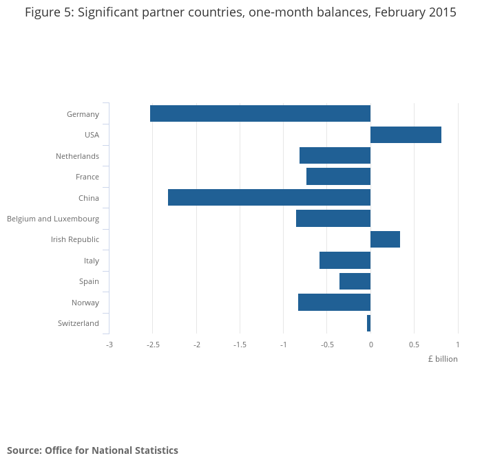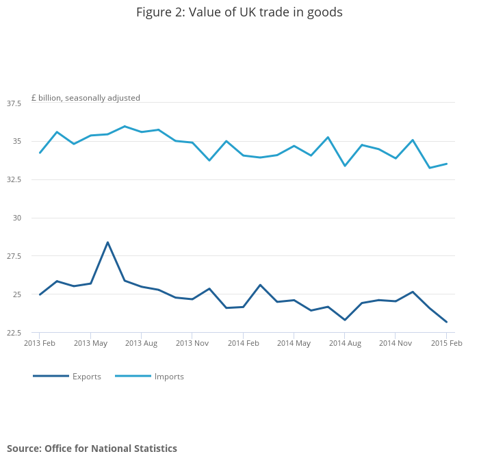 In February 2015, the UK’s deficit on trade in goods was £10.3 billion, widening by £1.2 billion from January 2015.