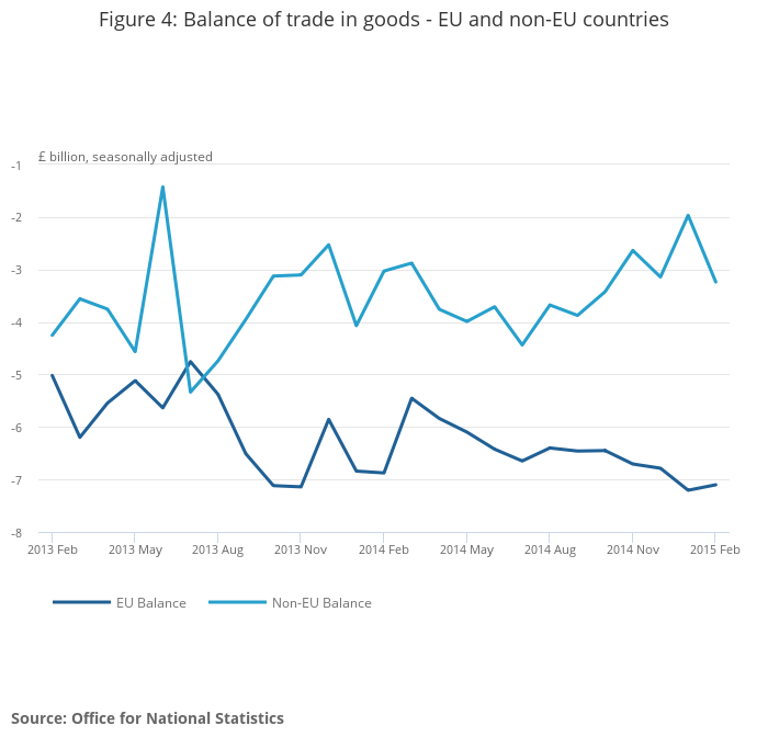 In February 2015, the deficit on trade in goods with EU countries narrowed by £0.1 billion to £7.1 billion. The deficit on trade in goods with non-EU countries widened by £1.3 billion to £3.2 billion (Figure 4).