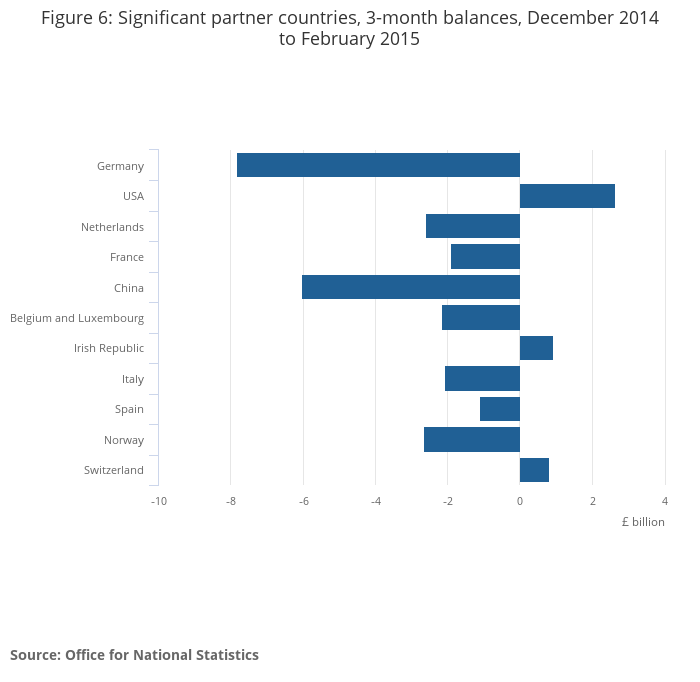 In the 3 months to February 2015, the total trade deficit narrowed by £0.4 billion to £6.5 billion. The narrowing reflects an increase in goods exported to countries outside the EU; specifically chemicals (up £0.9 billion) and a decrease in goods imported from outside the EU. Exports of services also increased over the same period. The narrowing was partially offset by a fall in exports of goods to the EU
