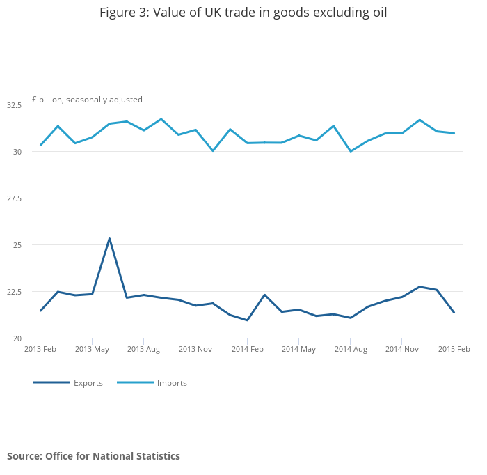 Focusing on trade in oil, the monthly deficit on oil was virtually unchanged at £0.7 billion in February 2015. Despite both exports and imports increasing from the previous month, the value of both transactions in the 3 months to February are the lowest for some time; 3 monthly export levels are the lowest since May 2009 and 3 monthly imports are the lowest since March 2010.