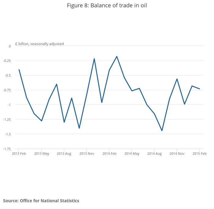 In the 3 months ending February 2015, the balance on trade in oil was in deficit by £2.4 billion, narrowing by £0.5 billion when compared with the previous 3 months. Oil exports decreased by £2.0 billion to £5.7 billion and oil imports decreased by £2.5 billion to £8.1 billion.