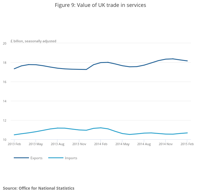 The surplus on trade in services was estimated to be £7.5 billion in February 2015; a £0.2 billion narrowing from the previous month. The slight fall in the surplus reflects a £0.1 billion decrease in exports and a £0.1 billion increase in imports.